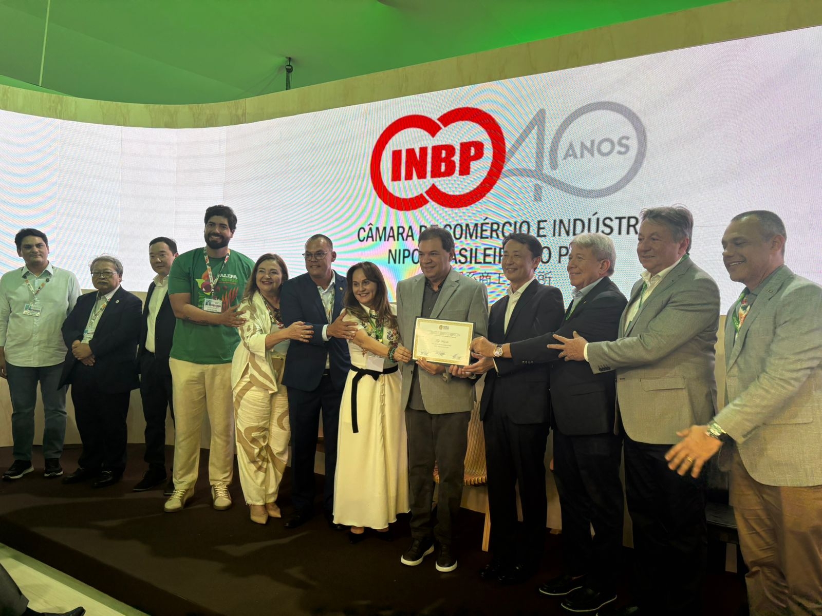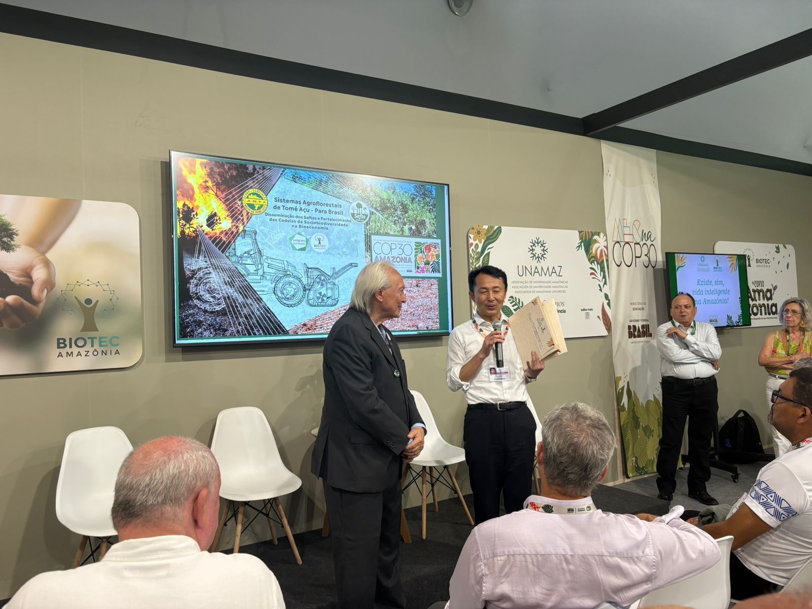 18日午後、COP30の会場にて、日本人移住地であるパラー州トメアスのアグロフォレストリーに関するセミナーに参加し、アマゾン地域における持続可能な農業のあり方について意見交換を行いました。また、大使として、日本とブラジルの関係強化及びトメアスのアグロフォレストリーの知名度向上に貢献したことに対し、表彰状が授与されました。
