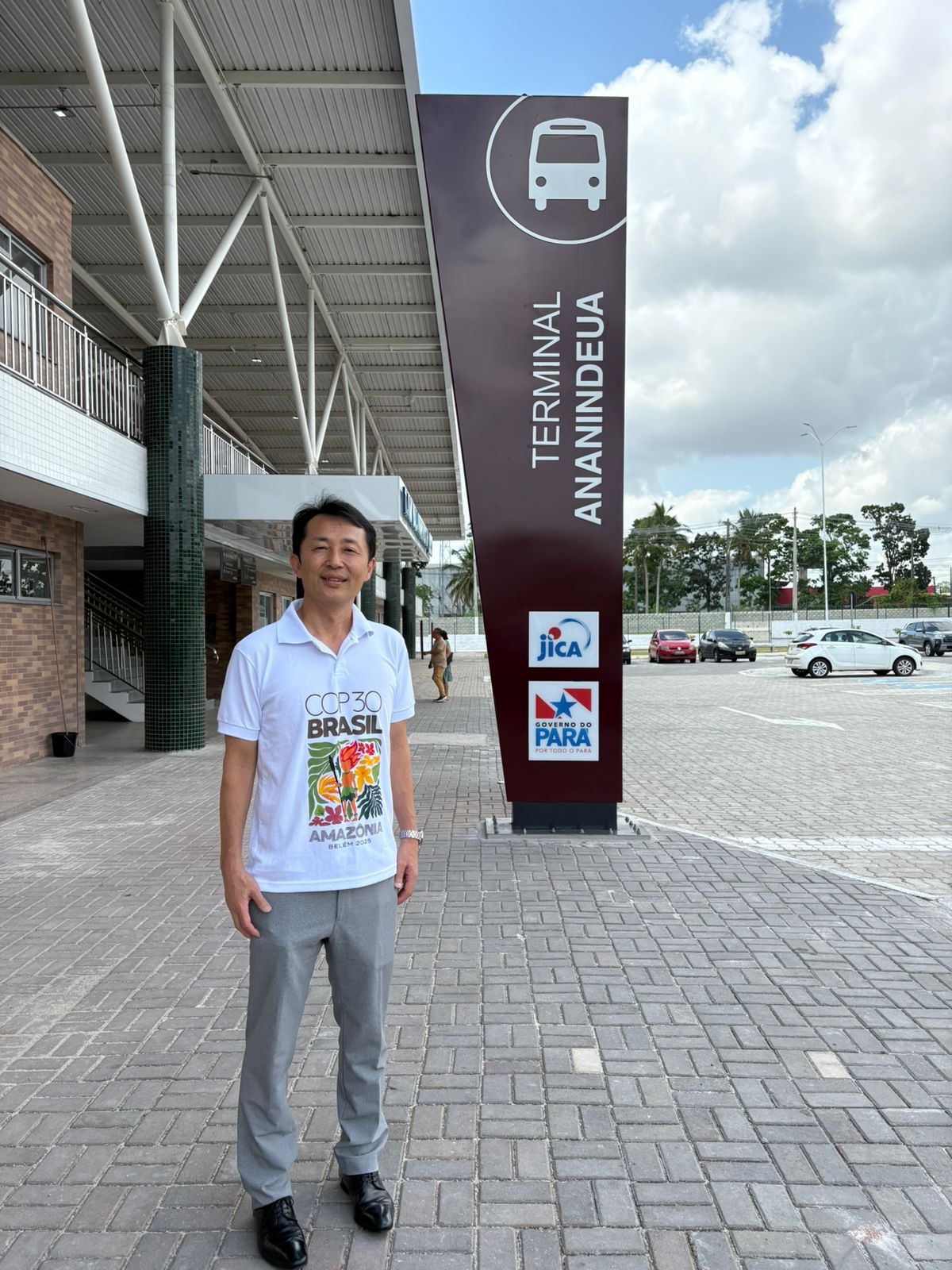 19日午前、日本政府が支援し10月末に開通したベレン都市圏幹線バスシステム(BRT)を視察し、実際に乗車して運行状況を確認しました。その後、日本人建築家・坂茂氏が設計し、COP30に合わせてベレン市内で展示された「紙のログハウス」を見学しました。