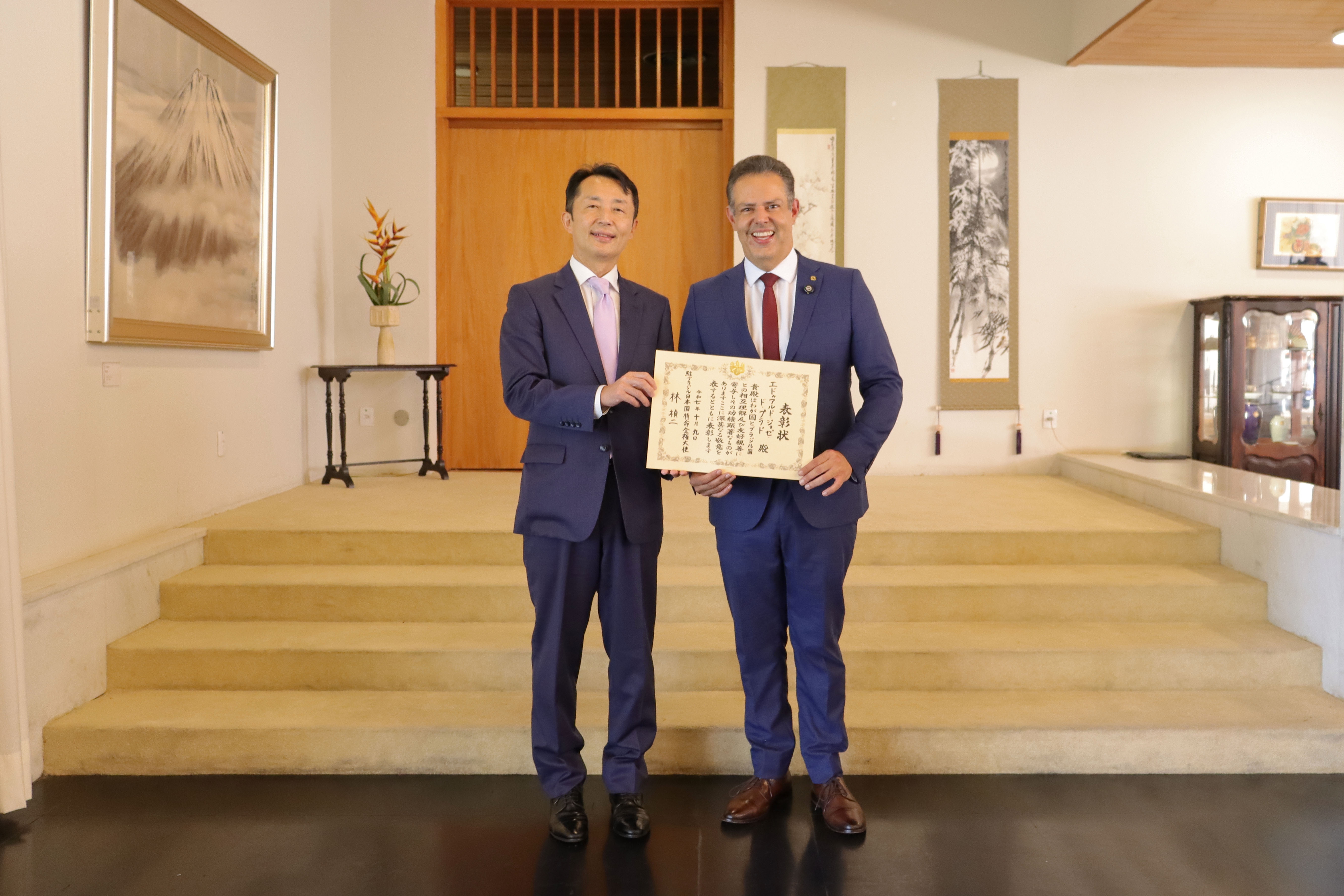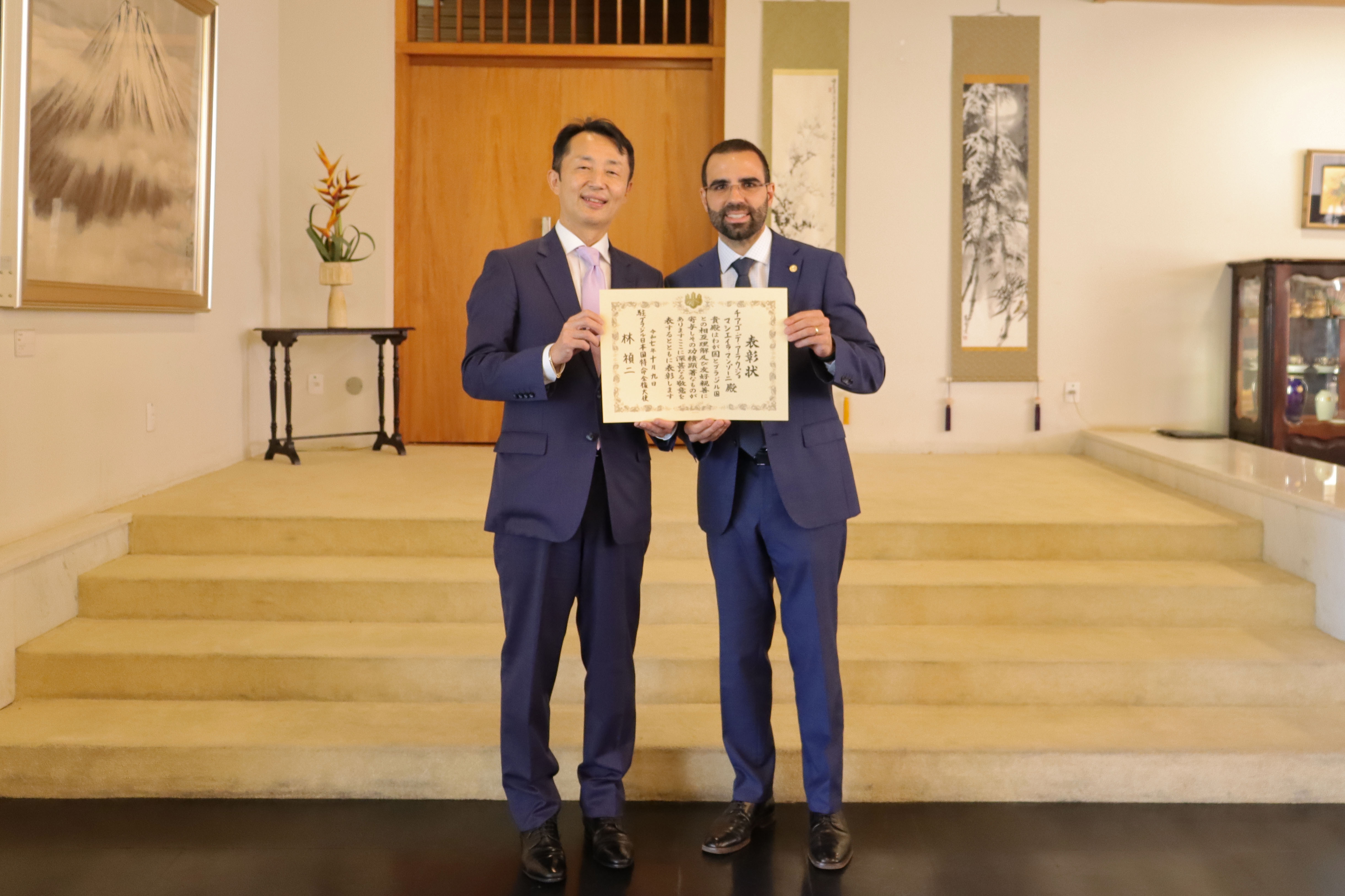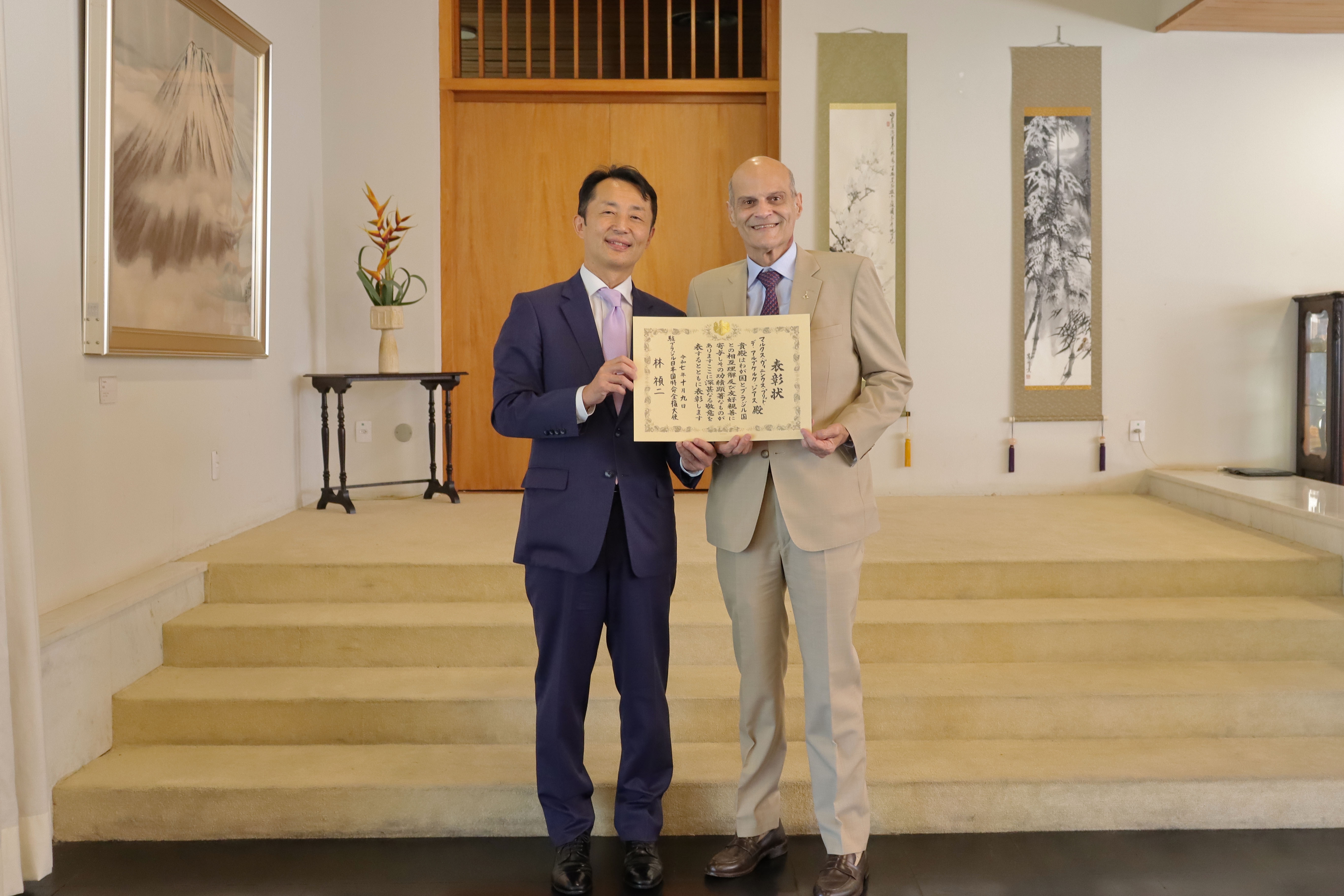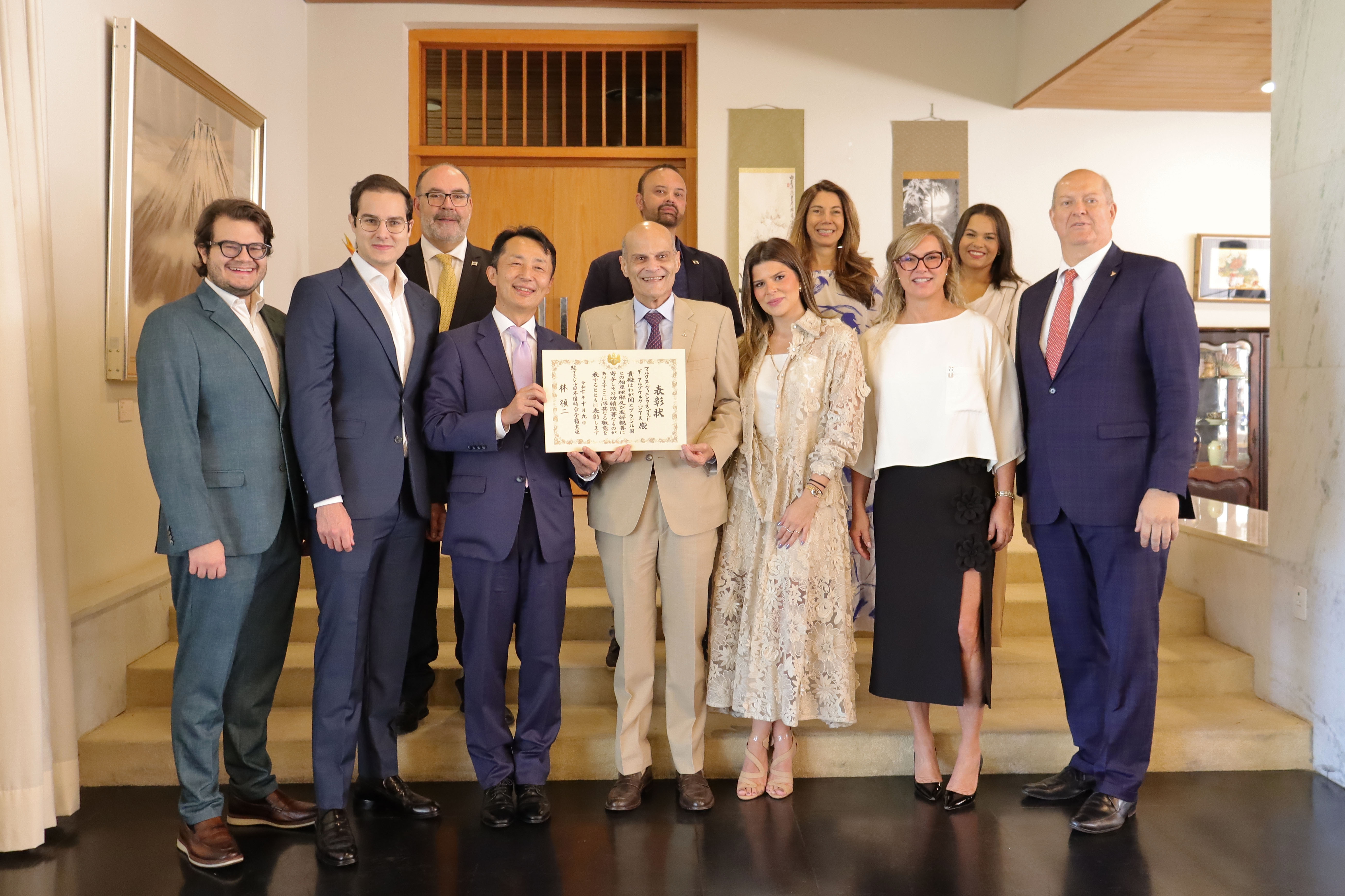 Em 9 de outubro, na residência oficial do Embaixador do Japão no Brasil, o Embaixador Hayashi outorgou os Diplomas de Honra ao Mérito do Embaixador do Japão no Brasil no ano 7 da Era Reiwa (2025) a três pessoas, em reconhecimento às notáveis contribuições para a promoção da cultura japonesa e o fortalecimento das relações de amizade entre o Japão e o Brasil. Confira aqui a íntegra das saudações do Embaixador.