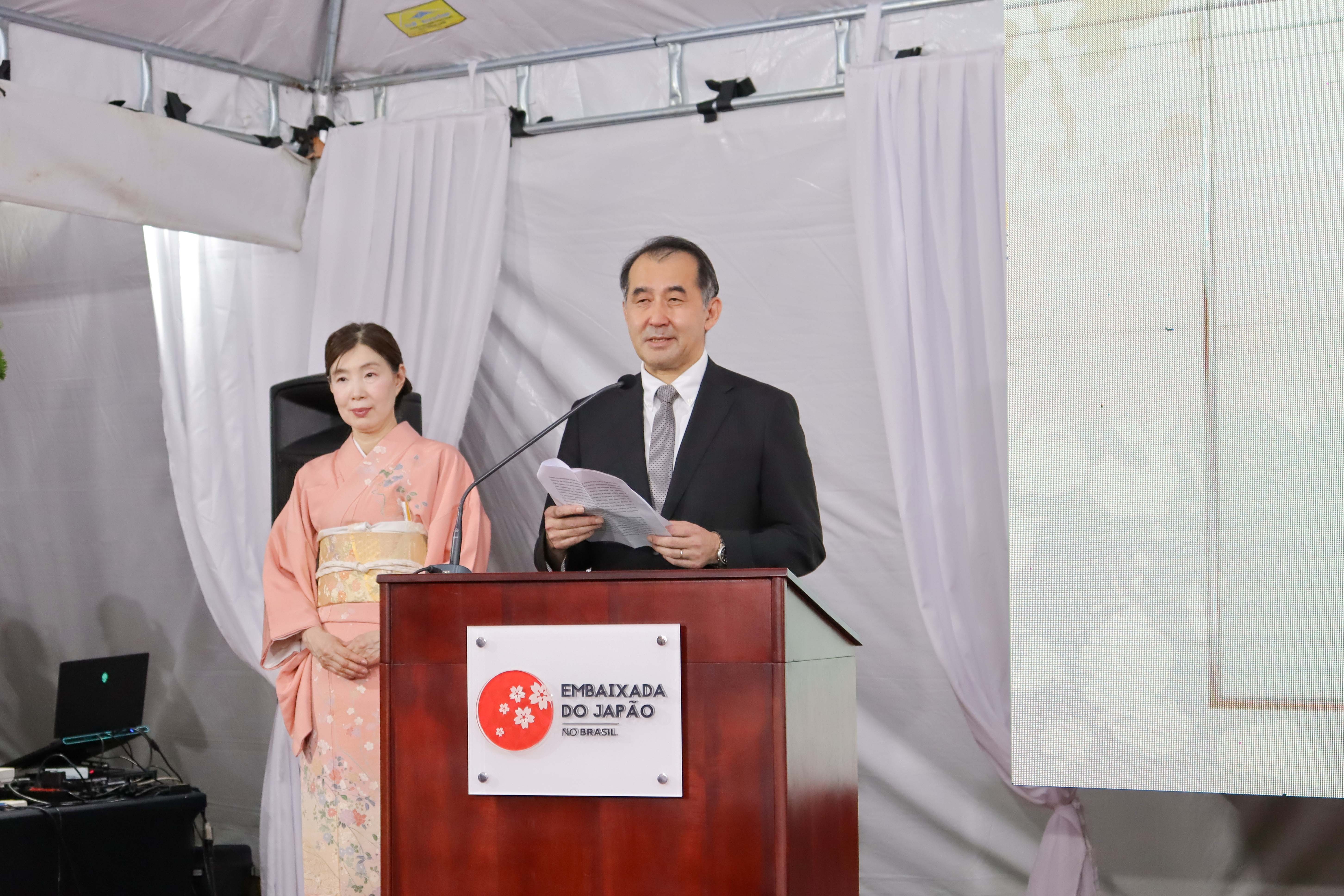 Em seu discurso, o Embaixador Noguchi destacou que, no ano passado, quando se celebrou o 130º aniversário do estabelecimento das relações diplomáticas entre o Japão e o Brasil, as relações políticas e econômicas entre os dois países, bem como os laços de amizade, foram ainda mais fortalecidos por meio da visita de Estado do Presidente Luiz Inácio Lula da Silva ao Japão e da visita ao Brasil de Sua Alteza Imperial, a Princesa Kako. O Embaixador também mencionou o aumento do número de brasileiros que visitam o Japão, o lançamento do “Marco de Parceria Estratégica Japão–Mercosul” e exemplos de cooperação no desenvolvimento de minerais estratégicos, reafirmando seu empenho em promover o contínuo fortalecimento e desenvolvimento das relações entre o Japão e o Brasil. Para ler o discurso completo do Embaixador Noguchi, acesse aqui o link.