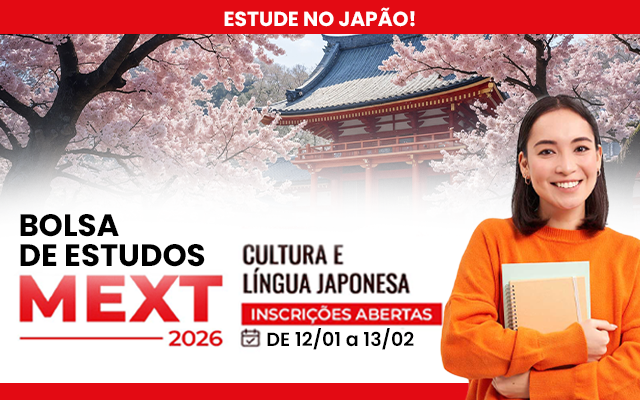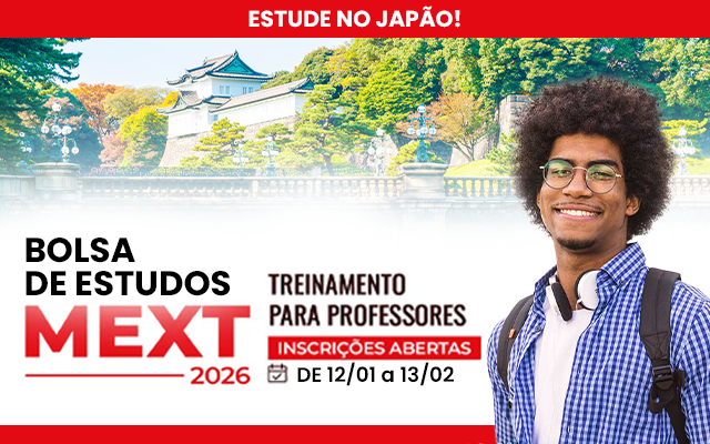 more Embaixada Contato Atendimento Mídias Sociais Feriado Palavras e palestra da Embaixada Comunidade Nikkei Serviço Consular Atendimento para visto Vistos Registros Aduana e Políticas Alfandegárias Outras Informações Bolsas de Estudos e Programas Bolsas de Estudo MEXT JET Programme Divulgação e Cultura Informações Sobre o Japão Turismo no Japão Revista Niponica Escolas de língua japonesa Estude a língua japonesa online Apoio Institucional Mostra de Cinema Japonês - Ayakashi: o Japão das Criaturas Místicas Bolsas de Estudo MEXT: Treinamento de Professores Bolsas de Estudo MEXT: Cultura e Língua Japonesa Notícias go to list 2026/1/20 Embaixada do Japão admite motorista 2026/1/13 Mostra de Cinema Japonês - Ayakashi: o Japão das Criaturas Místicas 2026/1/12 Bolsas de Estudo MEXT: Treinamento de Professores 2026 (inscrições abertas) Bolsas de Estudo MEXT: Cultura e Língua Japonesa (Letras Japonês) 2026 (inscrições abertas) Bolsas de Estudo MEXT: Cultura e Língua Japonesa (Para Descendentes de Japoneses) 2026 (inscrições abertas) 2025/12/15 Cumprimentos do Embaixador NOGUCHI Yasushi 2025/12/3 Mensagem de despedida do Embaixador HAYASHI Teiji 2025/11/26 Visita do Embaixador Hayashi ao Estado do Pará (18 a 20 de novembro) Visita do Embaixador Hayashi ao Estado do Rio Grande do Sul (13 a 15 de novembro) 2025/11/17 Segundo webinário do Grupo Internacional de Personalidades Eminentes por um Mundo Sem Armas Nucleares go to list Política Externa do Japão close Política Externa do Japão The First Japan-Brazil Working Group Meeting on Cybersecurity (16 de dezembro de 2025) The 6th Japan-Brazil Joint Committee on Cooperation in Science and Technology (21 de outubro de 2025) The 10th Consular Forum between Japan and the Federative Republic of Brazil (25 de junho de 2025) Courtesy Call on Prime Minister Ishiba by Japanese members of the Wise Group Meeting for Strategic Economic Partnership between Brazil and Japan chaired by Mr. IIJIMA Masami (3 de junho de 2025) Announcement of a Letter of Intent of the Recovery of Degraded Pasture with the Federative Republic of Brazil (26 de março de 2025) Japan-Brazil Summit Meeting (26 de março de 2025) Press Release close 2026/01/13 - Mostra de Cinema Japonês 2026 [201KB] 2025/10/13 - Mostra de ikebana celebra 130 anos de amizade entre Brasil e Japão [210KB] 2025/09/08 - Brasil comemora primeiro Dia Nacional da Ikebana [180KB] 2025/07/28 - Exposição: 80 anos de Hiroshima e Nagasaki – Inspirando a Cultura da Paz [181KB] 2025/06/24 - Festival do Japão [178KB] 2025/06/23 - Exposição revela versatilidade artística da caligrafia japonesa [178KB] 2025/06/03 - Japão Gastronômico 2025 [175KB] Press release anteriores Canal oficial pelo Governo japonês no YouTube sobre questão de sequestros: Anime “Megumi” close Embaixador NOGUCHI Yasushi Mens. do Embaixador Curriculum Vitae [110KB] SNS close Embaixada do Japão no Brasil - 在ブラジル日本国大使館 Descubra o Japão Recomendações de sites close Outras recomendações